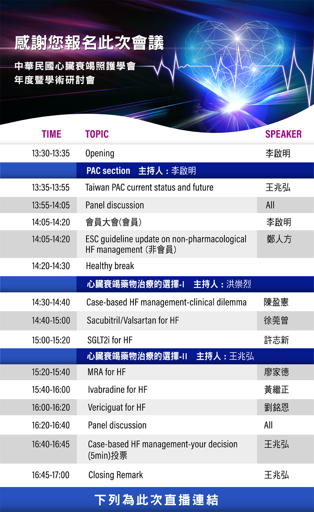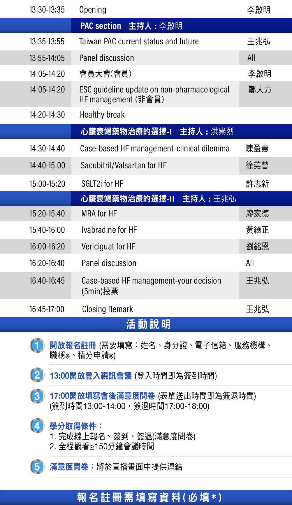 同意本會於所列目的之必要合理範圍內,蒐集及使用您的個人資料於積分申請,並完成積分申請相關規定,包含完成報名註冊、簽到、全程看完150分鐘、 會後問卷(視同簽退程序)缺一不可,未符合規定者恕不予計入。